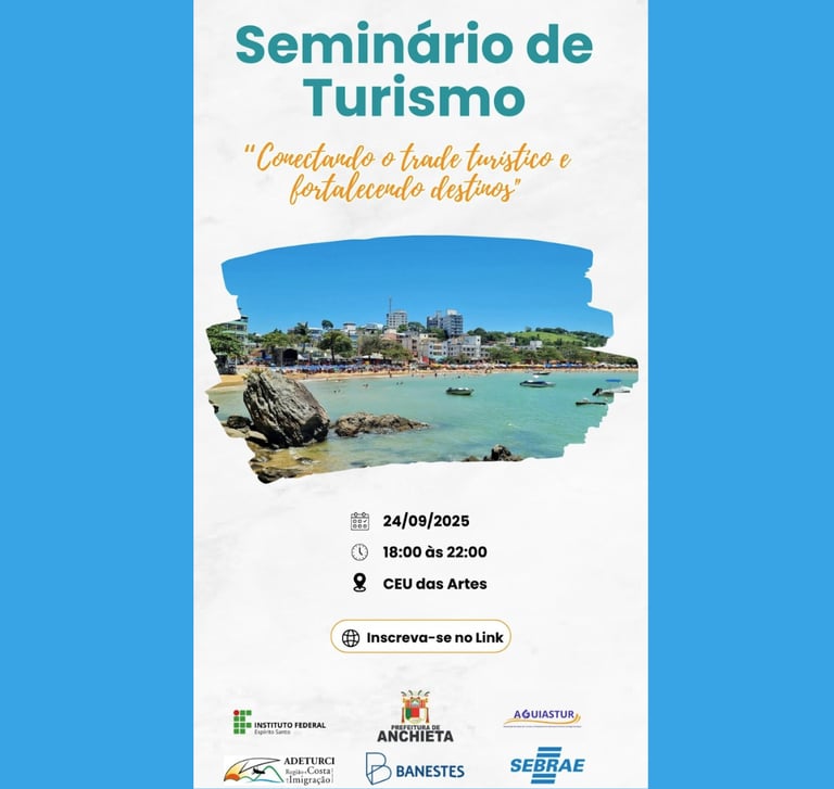 Participe do Seminário de Turismo em Anchieta no dia 24/09/2025, das 18h às 22h no CEU das Artes. Um encontro para profissionais de hospitalidade, gastronomia, cultura e agências, com palestras inspiradoras e networking. Inscreva-se gratuitamente e fortaleça os destinos do Espírito Santo!