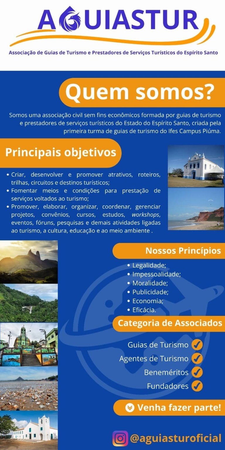 A Associação Guias de Turismo (AGUIASTUR) tem como missão fortalecer o turismo no litoral sul capixaba por meio da valorização da cultura local, da profissionalização dos guias e da promoção de experiências autênticas para visitantes e moradores.