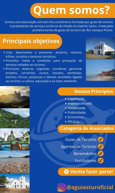 A AGUIASTUR – Associação dos Guias de Turismo da Região do Espírito Santo nasceu do desejo coletivo de fortalecer o turismo regional por meio da valorização dos profissionais que estão na linha de frente da experiência turística: os guias de turismo. Fundada por um grupo comprometido com a excelência, a ética e a promoção da cultura capixaba, a AGUIASTUR tem como missão integrar, capacitar e representar os guias que atuam nos municípios da chamada principalmente na "Região da Costa e Imigração" — um território rico em natureza, história, cultura e diversidade.