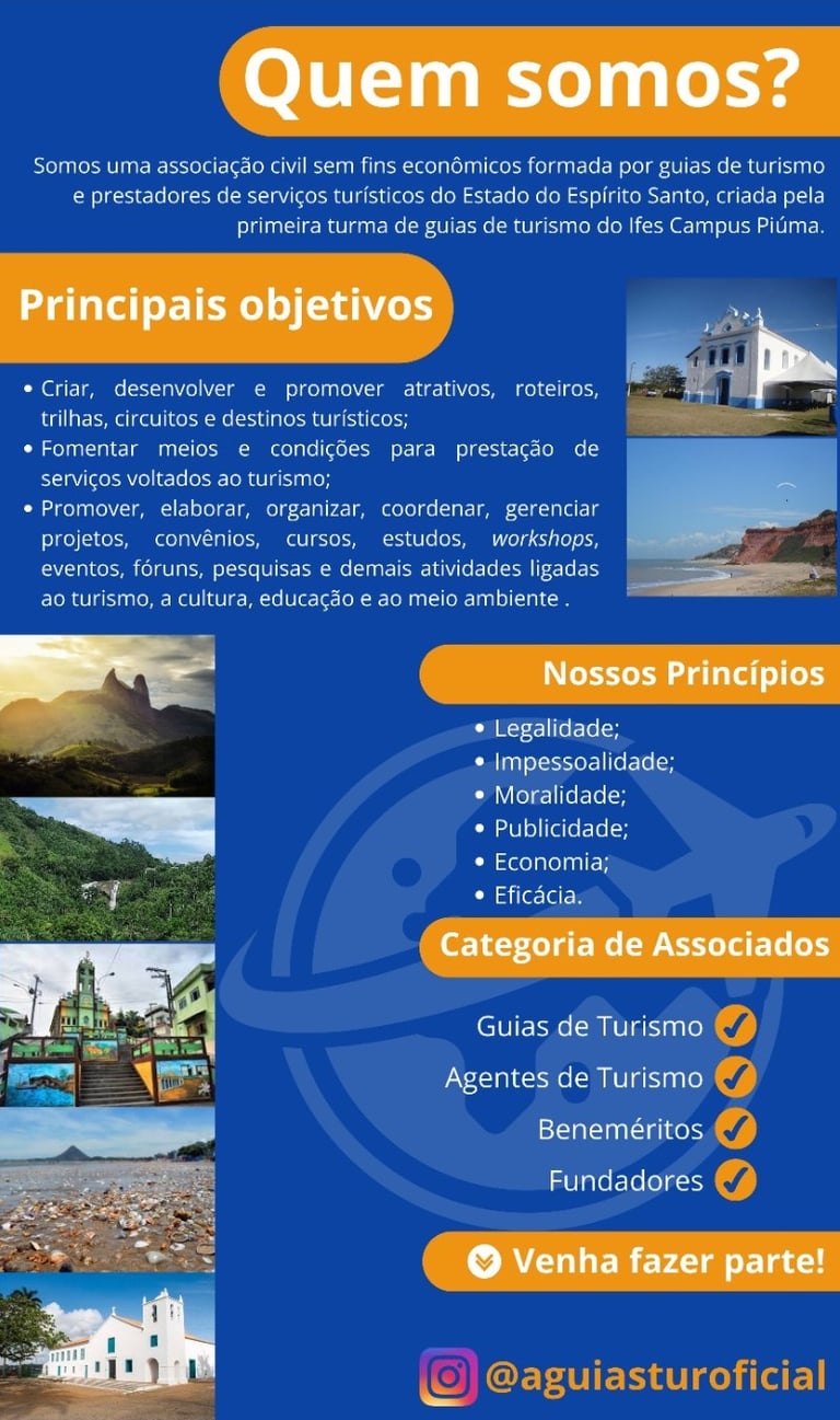 Com sede em Piúma, Espírito Santo, e atuação em municípios como Anchieta, Itapemirim, Marataízes, Presidente Kenedy, Iconha e Rio Novo do Sul, mas apesar de estar firme no propósito de divulgar essa região também atuando em outros municípios e estados brasileiros. A AGUIASTUR promove ações de capacitação, através no nosso presidente Rozinere Bernardi, encontros de networking, participação em feiras e eventos de turismo, além de representar seus associados em fóruns e conselhos municipais e estaduais. A associação também desenvolve projetos que visam destacar a história da imigração europeia, as riquezas da cultura caiçara e a beleza do litoral e montanhas capixabas, criando uma identidade turística sólida e respeitada.